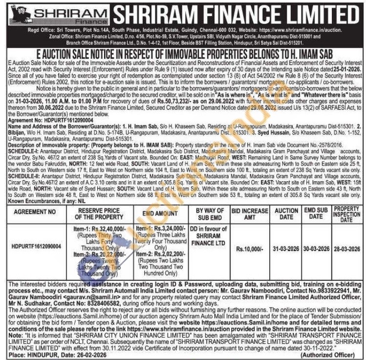 Description of immovable property: (Property belongs to H. IMAM SAB): Property standing in the name of H. Imam Sab vide Document No.-2578/2016. SCHEDULE-I: Anantapur District, Hindupur Registration District, Madakasira Sub District, Madakasira Mandal, Madakasira Gram Panchayat and Village accounts, Circar Dry, Sy: No. 467/2 an extent of 238 Sq. Yards of Vacant site. Bounded On: EAST: Madhugiri Road, WEST: Remaining Land in Same Survey Number belongs to the vendor Babu Fakruddin, NORTH: 12 feet wide Road, SOUTH: Vacant Land of H. Imam Sab; Within these site admeasuring North to South on Eastern side 25 ft, North to South on Western side 17 ft, East to West on Northern side 104 ft, East to West on Southern side 100 ft., totaling an extent of 238 Sq Yards vacant site only