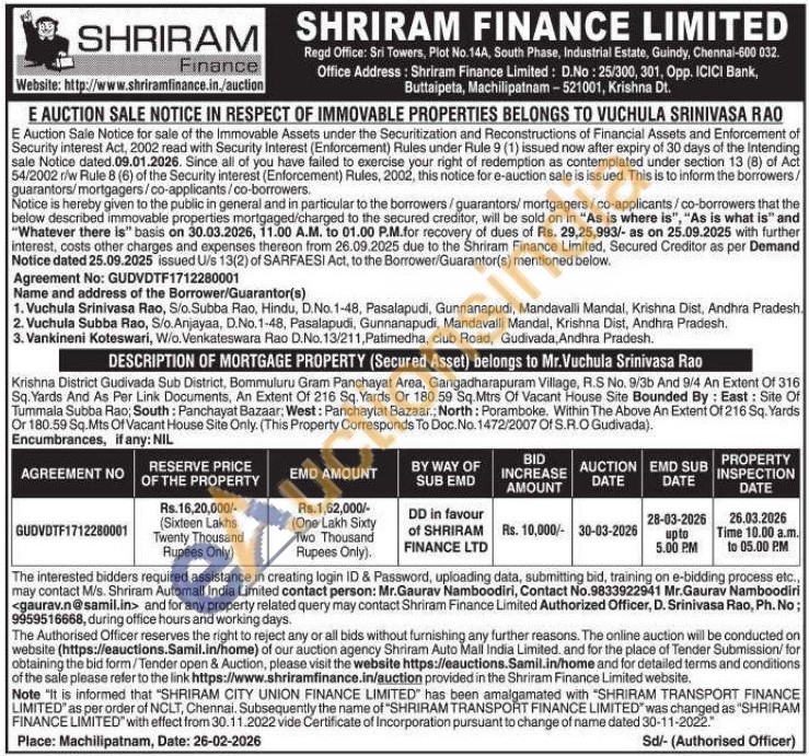 Authorized Officer,D. Srinivasa Rao Phone No; 9959516668