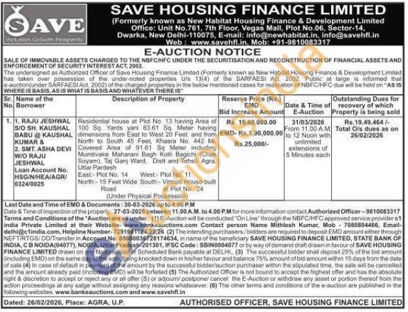 Residential house at Plot No. 13 having Area of 100 Sq Yards yani 83.61 Sq. Meter having dimensions from East to West 20 Feet and from North to South 45 Feet, Khasra No. 442 M Covered Area of 91.61 Sq Meter induding Mumbivake Maharani Bagh Kotli Bagichi (Chak Soyam), Taj Ganj Ward, Distt and Tehsil Agra Littar Pardesh East-Plot No. 14 West- Plot No. 11 North-15 Feet Wide South-Virnati House built Road at Plot No. 24