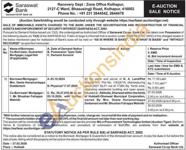All the piece and parcel of N. A. Land/Plot bearing N.A. Plot No. 1/A/2A/1A, (Admeasuring about 3427 Sq.Ft. out of 17364 Sq. Yards area, consisting residential building and open space, Situated at: Attikolla, Dharwad within the limits of Hubballi-Dharwad Municipal Corporation, owned By Mrs. Geeta Hanamantappa Dodamani and Mr. Bhushan Fairappa Walmiki