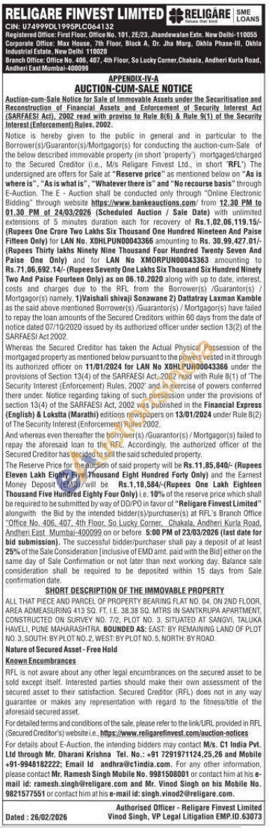 SHORT DESCRIPTION OF THE IMMOVABLE PROPERTY : ALL THAT PIECE AND PARCEL OF PROPERTY BEARING FLAT NO. 04. ON 2ND FLOOR, AREA ADMEASURING 413 SQ. FT. 1.E. 38.38 SQ. MTRS IN SANTKRUPA APARTMENT, CONSTRUCTED ON SURVEY NO. 7/2, PLOT NO. 3. SITUATED AT SANGVI, TALUKA HAVELI, PUNE MAHARASHTRA BOUNDED AS: EAST BY REMAINING LAND OF PLOT NO. 3. SOUTH BY PLOT NO. 2. WEST: BY PLOT NO. 5. NORTH BY ROAD