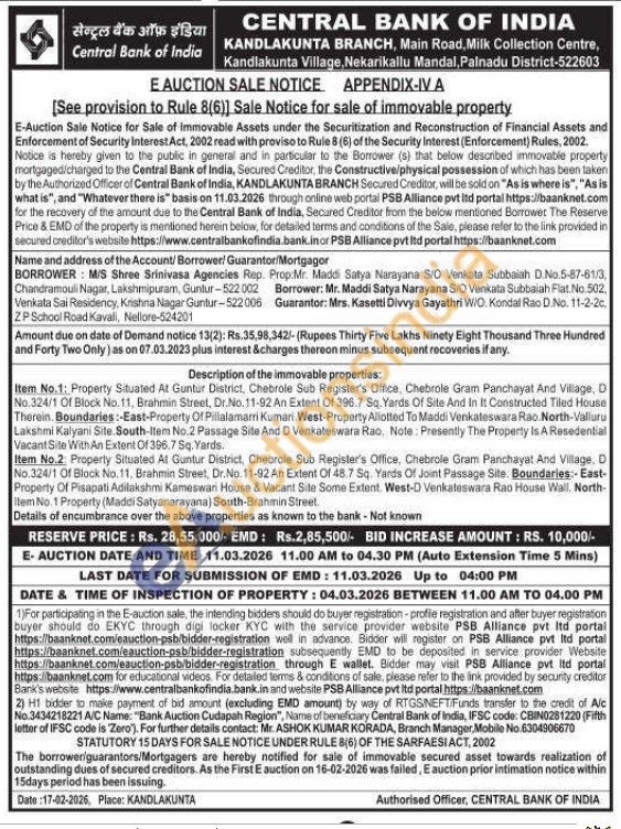 Item No.1: Property Situated At Guntur District, Chebrole Sub Register's Office, Chebrole Gram Panchayat And Village, D No.324/1 Of Block No.11, Brahmin Street, Dr.No. 11-92 An Extent Of 396.7 Sq. Yards Of Site And In It Constructed Tiled House Therein. Boundaries:-East-Property Of Pillalamari Kumari West-Property Allotted To Maddi Venkateswara Rao North-Valluru Lakshmi Kalyani Site. South-Item No.2 Passage Site And D Venkateswara Rao. Note: Presently The Property Is A Resedential Vacant Site With An Extent Of 396.7 Sq. Yards. Item No.2: Properly Situated Al Guntur District, Chebrole Sub Register's Office, Chebrole Gram Panchayat And Village. D No.324/1 Of Block No.11, Brahmin Street, Dr.No.11-92 An Extent Of 48.7 Sq. Yards Of Joint Passage Site. Boundaries:-East-Property Of Pisapati Adilakshmi Kameswan House & Vacant Site Some Extent. West-D Venkateswara Rao House Wall, North- Item No. 1 Property (Maddi Satyanarayana) South-Brahmin Street.