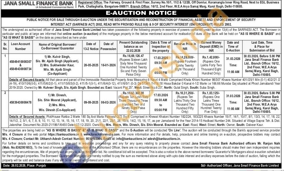 Details of Secured Assets: Plot/House Rakba 2 Marie 180 Sq.foot Marla Paimaish 272 Sq.ft. Comprised in Khewat Khatoni Number 182/224, 183/225 Khasra Number 15//7, 14/1, 10/7, 8/1, 13/3, 14, 17, 18, 22, 14/1/2, 2, 5/1, 6, 7, 8, 9, 10, 11, 12, 13, 14, 15, 16, 17, 18, 19, 20, 21/1, 22/1, 23/1, 28, 15/6, 14/2, 15, 16, 17, as per Jamabandi for the Year 2014-15 Hadbast Number 244. Situated at Village Saprai Teh. & Dist. Jalandhar, Document No. 2020-21/186/1/6450 Dated 07-12-2020. Owned by Mrs. Meera, Wio, Dinesh, S/o. Shiv Moorat. Bounded as: East: Road, West: Street, North: Owner, South: Dalveer Kaur,