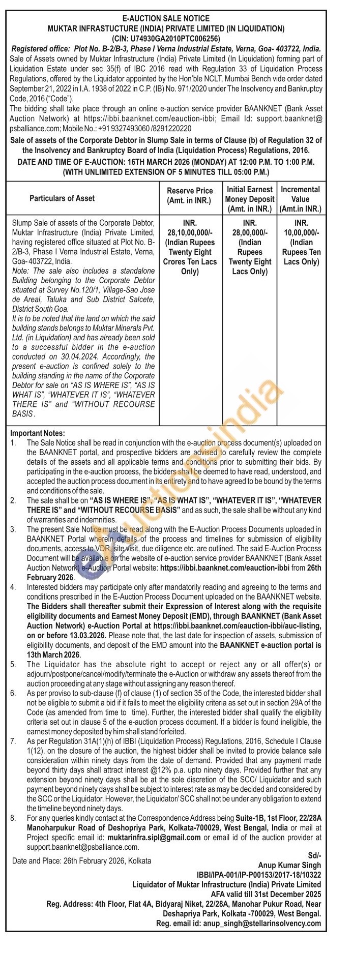 Slump Sale of assets of the Corporate Debtor, Muktar Infrastructure (India) Private Limited, having registered office situated at Plot No. B-2/B-3, Phase I Verna Industrial Estate, Verna, Goa-403722, India. Note: The sale also includes a standalone Building belonging to the Corporate Debtor situated at Survey No. 120/1, Village-Sao Jose de Areal, Taluka and Sub District Salcete, District South Goa. It is to be noted that the land on which the said building stands belongs to Muktar Minerals Pvt. Ltd. (in Liquidation) and has already been sold to a successful bidder in the e-auction conducted on 30.04.2024. Accordingly, the present e-auction is confined solely to the building standing in the name of the Corporate Debtor for sale on "AS IS WHERE IS", "AS IS WHAT IS", "WHATEVER IT IS", "WHATEVER THERE IS" and "WITHOUT RECOURSE BASIS.