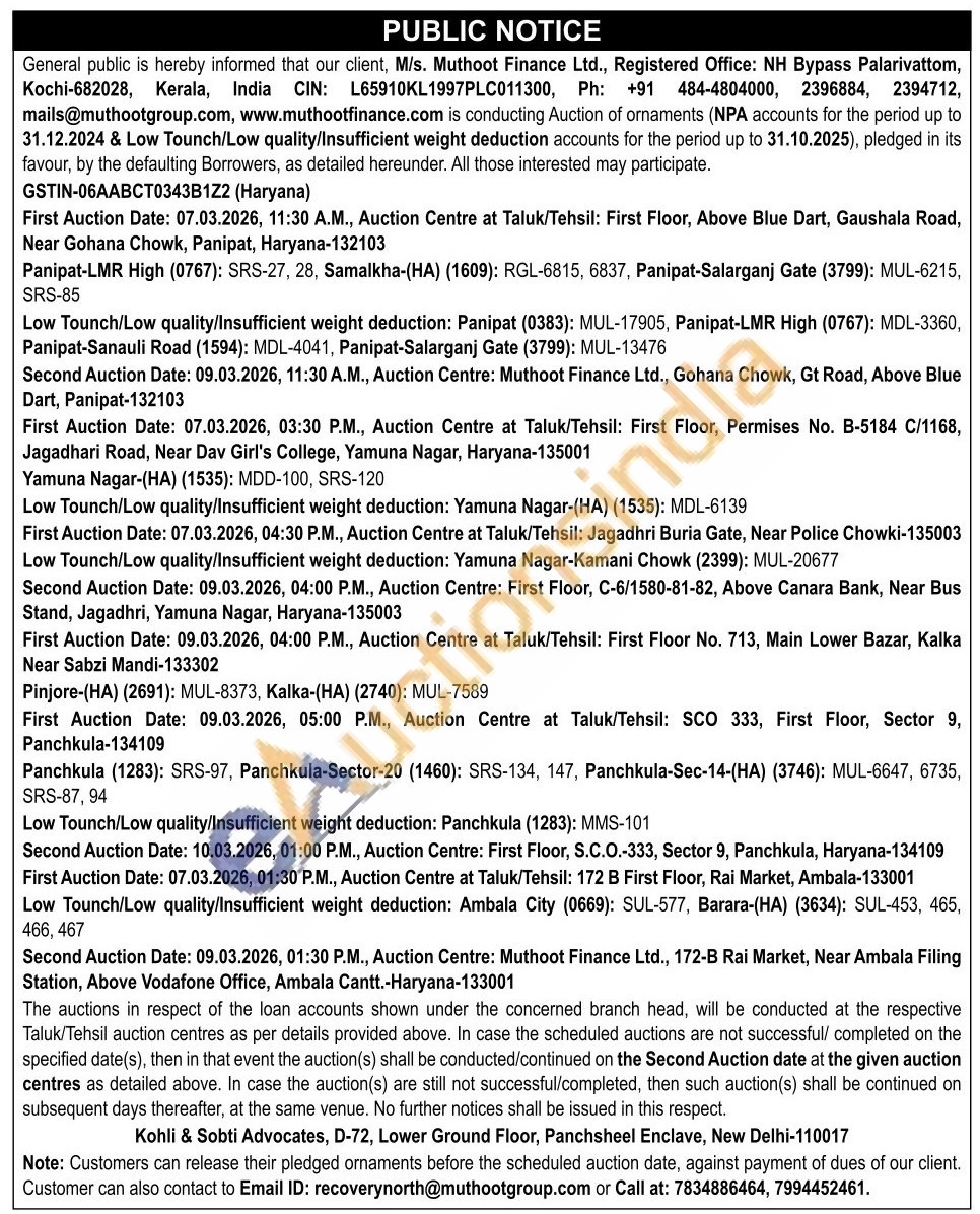Muthoot Finance Ltd Gold Auctions Auction in Panipat
