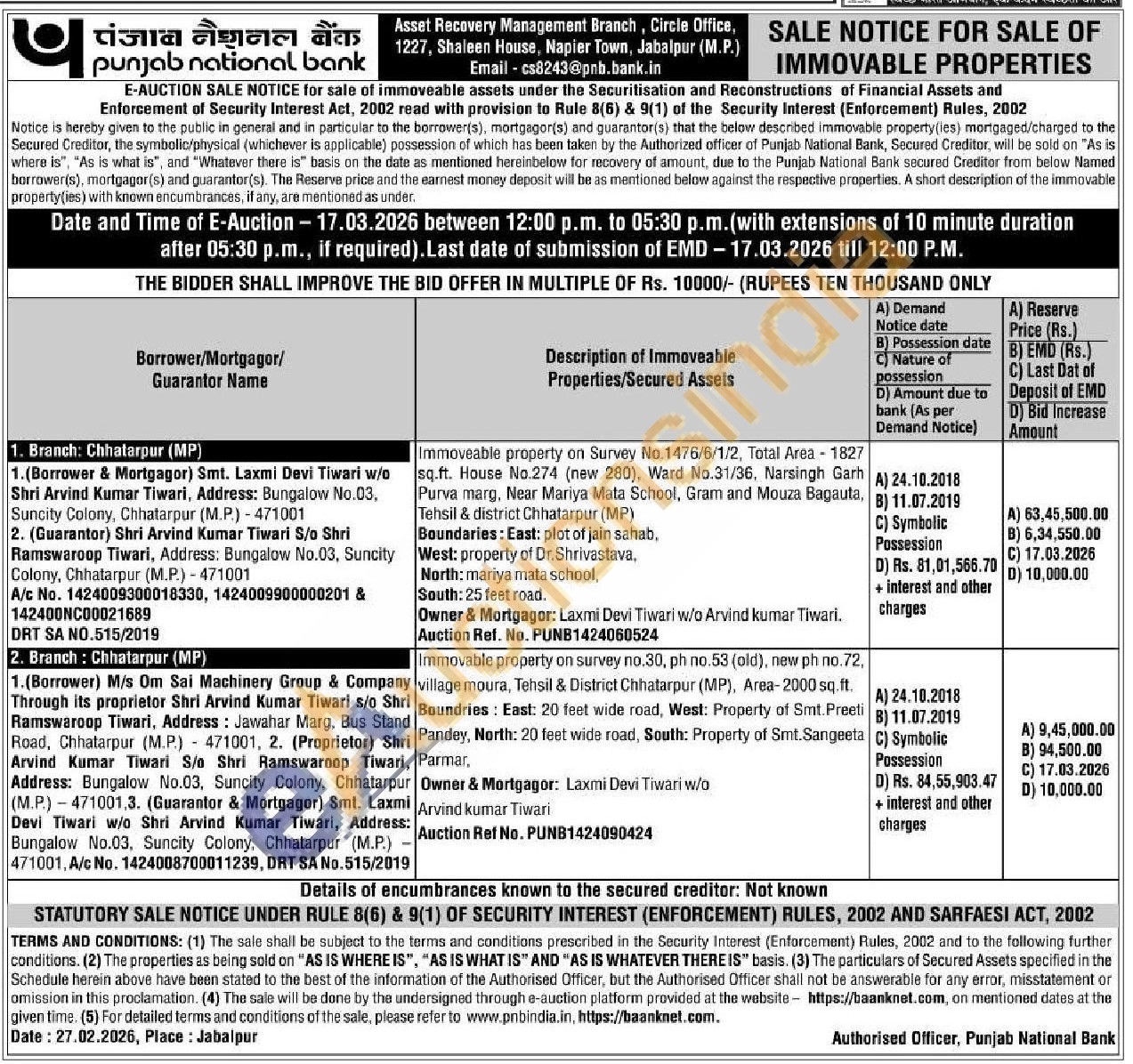 Immovable property on survey no.30, ph no.53 (old), new ph no.72, West: Property of Smt. Preeti village moura, Tehsil & District Chhatarpur (MP), Area-2000 sq.ft. Boundries: East: 20 feet wide road, Pandey, North: 20 feet wide road, South: Property of Smt.Sangeeta Parmar,