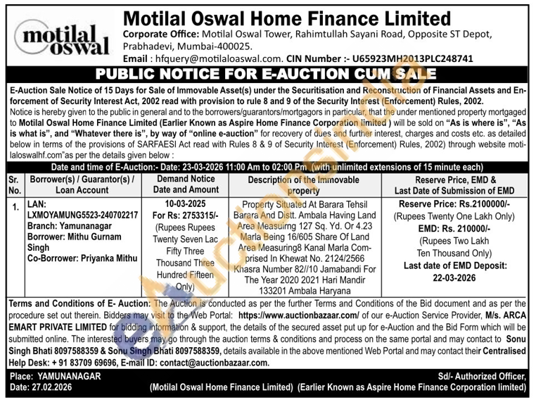 Property Situated At Barara Tehsil Barara And Distt. Ambala Having Land Area Measuirng 127 Sq. Yd. Or 4.23 Marla Being 16/605 Share Of Land Area Measuring8 Kanal Marla Com-prised In Khewat No. 2124/2566 Khasra Number 82//10 Jamabandi For The Year 2020 2021 Hari Mandir 133201 Ambala Haryana