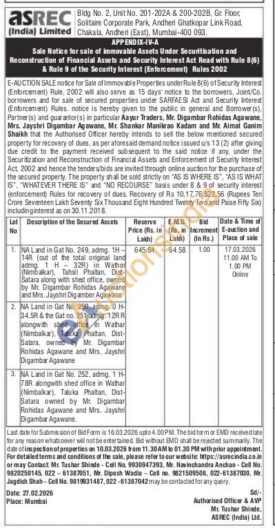 NA Land in Gat No. 249, admg. 1H 14R (out of the total original land admg. 1 H 32R) in Wather (Nimbalkar), Tahsil Phaltan, Dist-Satara along with shed office, owned by Mr. Digambar Rohidas Agawane and Mrs. Jayshri Digamber Agawane