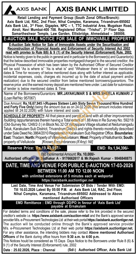 SCHEDULE OF PROPERTY: All that piece and parcel of land with all other improvements /building/appurtenances therein having a Total extent of 1.88 Ares in Re Survey No. 592/18 (Old-Survey No. 1248/2-3) in Block No.32 Of Vattappara Village situated at Nedumangadu Taluk, Karakulam Sub District, Trivandrum District and rights thereto morefully described under Sale Deed No.3864/2010 Registered in Karakulam Sub Registrar Office. Boundaries: East: Thadam; North: Property of Villayilveetuvilakam; West: Property of Nalluthambi; South: property of Vellukode