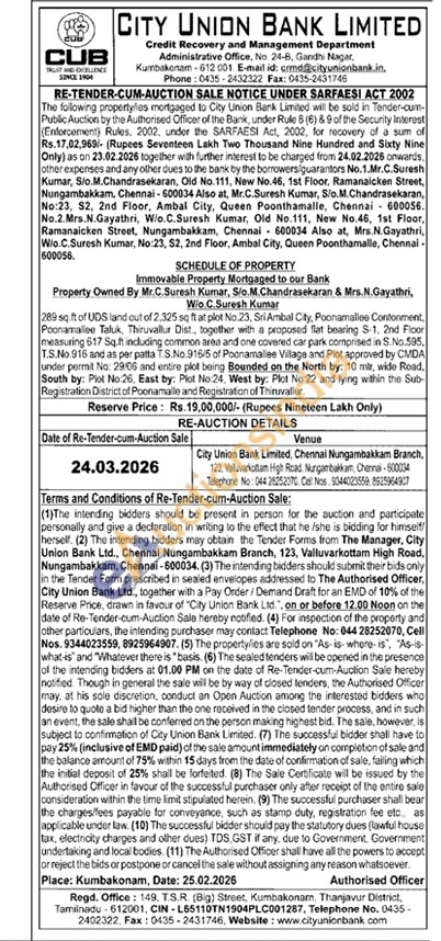 289 sq.ft of UDS land out of 2,325 sq ft at plot No.23, Sri Ambal City, Poonamallee Contonment, Poonamallee Taluk, Thiruvallur Dist., together with a proposed flat bearing S-1, 2nd Floor measuring 517 Sq.ft including common area and one covered car park comprised in S.No.595, T.S.No.916 and as per patta T.S.No.916/5 of Poonamallee Village and Plot approved by CMDA under permit No: 29:06 and entire plot being Bounded on the North by: 10 mlr, wide Road, South by: Plot No.26, East by: Plot No:24. West by: Plot No 22 and lying within the Sub-Registration District of Poonamalle and Registration of Thiruvallur.