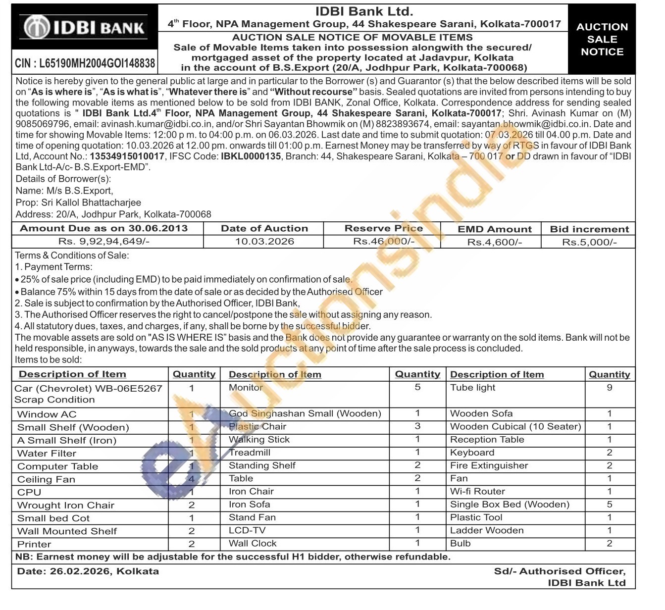 Car (Chevrolet) WB-06E5267 Scrap Condition Window AC Small Shelf (Wooden) 1 Plastic Chair 3 Wooden Cubical (10 Seater) 1 A Small Shelf (Iron) 1 Walking Stick 1 Reception Table 1 Water Filter 1 Treadmill 1 Keyboard 2 Computer Table 1 Standing Shelf 2 Fire Extinguisher 2 Ceiling Fan 4 Table 2 Fan 1 CPU 1 Iron Chair 1 Wi-fi Router 1 Wrought Iron Chair 2 Iron Sofa 1 Single Box Bed (Wooden) 5 Small bed Cot 1 Stand Fan 1 Plastic Tool 1 Wall Mounted Shelf 2 LCD-TV 1 Ladder Wooden 1 Printer 2 Wall Clock