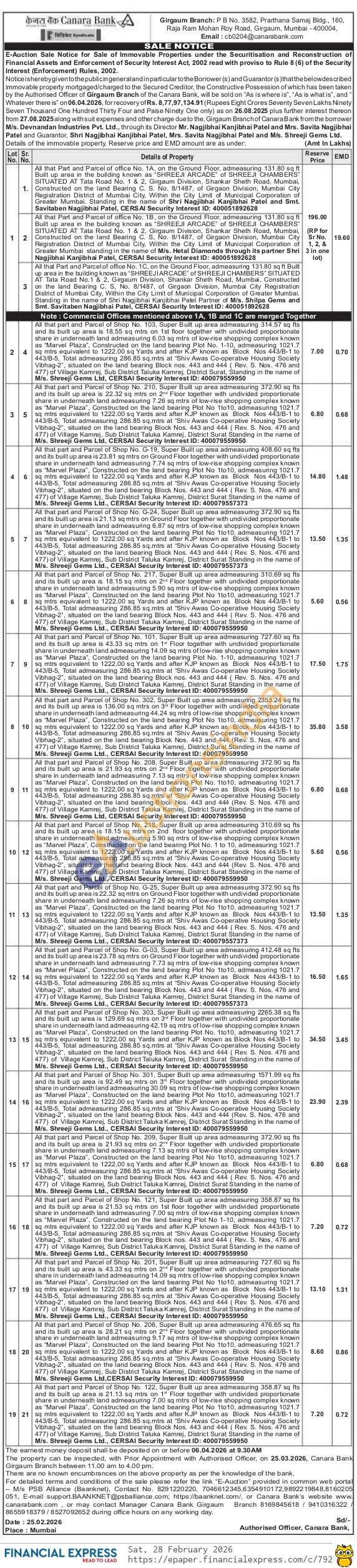 All that part and Parcel of Shop No. 121, Super Built up area admeasuring 358.87 sq fts and its built up area is 21.53 sq mtrs on 1st floor together with undivided proportionate share in underneath land admeasuring 7.00 sq mtrs of low-rise shopping complex known as "Marvel Plaza", Constructed on the land bearing Plot No 1-10, admeasuring 1021.7 sq mtrs equivalent to 1222.00 sq Yards and after KJP known as Block Nos 443/B-1 to 443/B-5, Total admeasuring 286.85 sq.mtrs at "Shiv Awas Co-operative Housing Society Vibhag-2", situated on the land bearing Block nos. 443 and 444 (Rev. S. Nos. 476 and 477) of Village Kamrej, Sub District Taluka Kamrej, District Surat Standing in the name of M/s. Shreeji Gems Ltd., CERSAI Security Interest ID: 400079559950