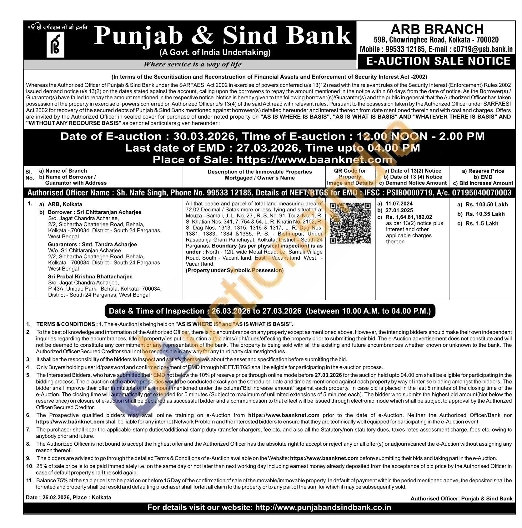 All that peace and parcel of total land measuring area of 72.02 Decimal/Satak more or less, lying and situated at Mouza - Samali, J. L. No. 23, R. S. No. 91, Touzi No. 1, R. S. Khatian Nos. 341, 7, 754 & 54, L. R. Khatin No. 2102, R S. Dag Nos. 1313, 1315, 1316 & 1317, L. R. Dag Nos. 1381, 1383, 1384 &1385, P. S. Bishnupur, Under Rasapunja Gram Panchayat, Kolkata, District South 24 Parganas. Boundary (as per physical inspection) is as under: North-12ft. wide Metal Road, i.e. Samali Village Road, South Vacant land, East Vacant land, West Vacant land. (Property under Symbolic Possession)