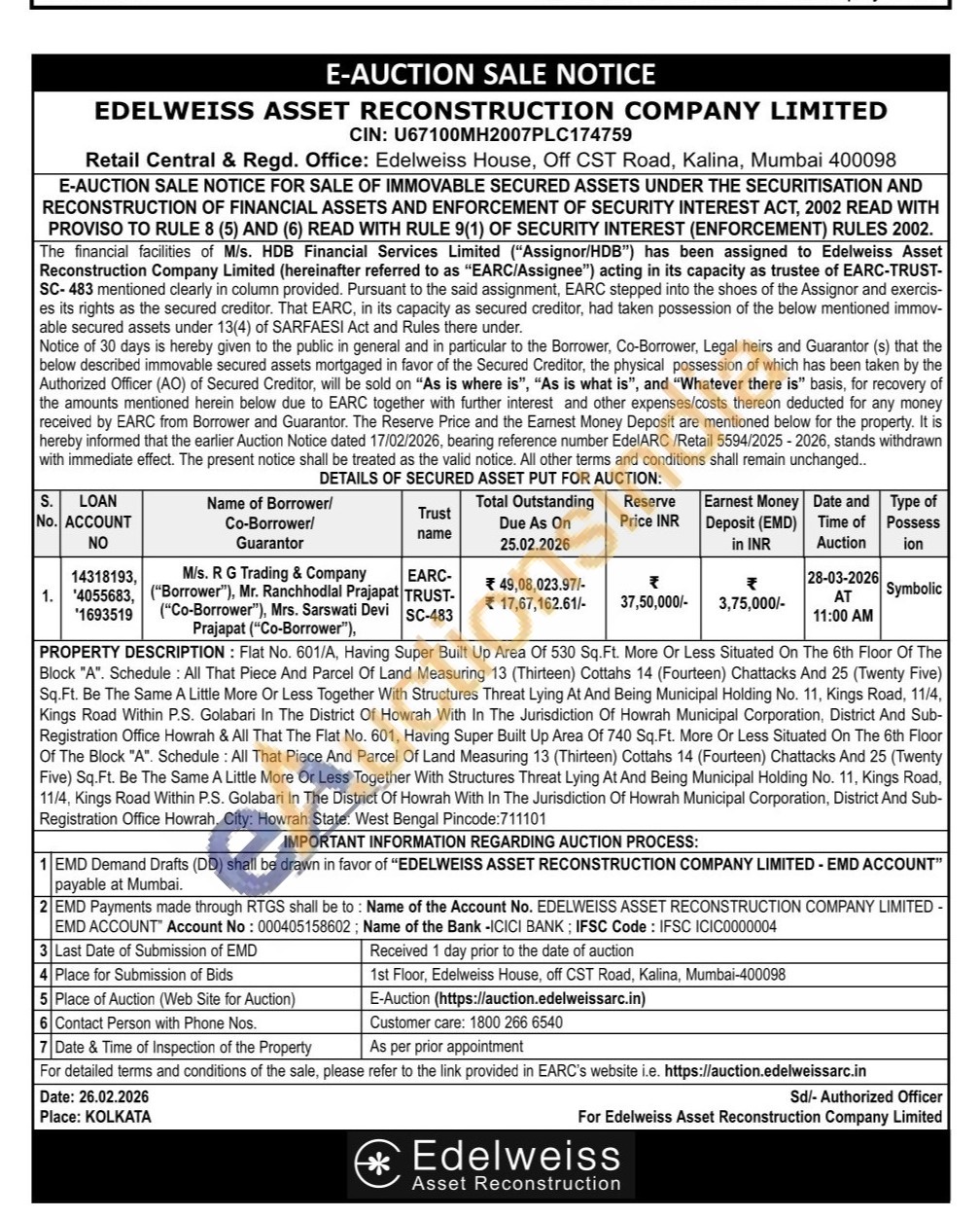 PROPERTY DESCRIPTION: Flat No. 601/A, Having Super Built Up Area Of 530 Sq.Ft. More Or Less Situated On The 6th Floor Of The Block "A". Schedule: All That Piece And Parcel Of Land Measuring 13 (Thirteen) Cottahs 14 (Fourteen) Chattacks And 25 (Twenty Five) Sq.Ft. Be The Same A Little More Or Less Together With Structures Threat Lying At And Being Municipal Holding No. 11, Kings Road, 11/4, Kings Road Within P.S. Golabari In The District Of Howrah With In The Jurisdiction Of Howrah Municipal Corporation, District And Sub-Registration Office Howrah & All That The Flat No. 601, Having Super Built Up Area Of 740 Sq.Ft. More Or Less Situated On The 6th Floor Of The Block "A". Schedule: All That Piece And Parcel Of Land Measuring 13 (Thirteen) Cottahs 14 (Fourteen) Chattacks And 25 (Twenty Five) Sq.Ft. Be The Same A Little More Or Less Together With Structures Threat Lying At And Being Municipal Holding No. 11, Kings Road, 11/4, Kings Road Within P.S. Golabari In The District Of Howrah With In The Jurisdiction Of Howrah Municipal Corporation, District And Sub-Registration Office Howrah. City: Howrah State: West Bengal Pincode:711101