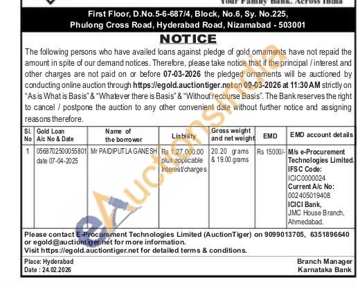 Karnataka Bank Gold Auctions Auction in Nizamabad