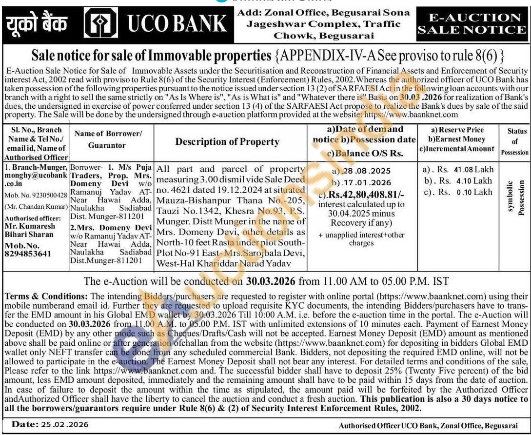 All part and parcel of property measuring 3.00 dismil vide Sale Deed no. 4621 dated 19.12.2024 at situated Mauza-Bishanpur Thana No.-205, Tauzi No. 1342, Khesra No.93, P.S. Munger. Distt Munger in the name of Mrs. Domeny Devi, other details as North-10 feet Rasta under plot South-Plot No-91 East-Mrs.Sarojbala Devi, West-Hal Khariddar Narad Yadav