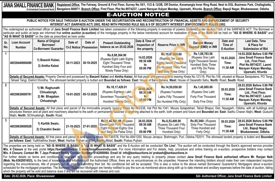 All that piece and parcel of land bearing Khata No. 136/578, Plot No.494/1250, Mouza Jenapur, Brahmagiri, Puri, Odisha-752011. The aforesaid landed property is butted and Bounded as follows: East: Yudhhisthira Swain, West: Harihar Pujhari and Ors, North: Road, South: Prakas Pujhari.