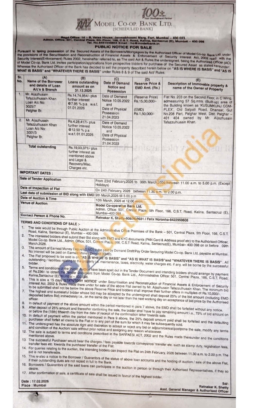 Flat No. 203 on the Secorid Floor, in C Wing admeasuring 57 Sq.mtrs. (Built-up) -up) area of the Building known as 'KUSUMKUNJ COM PLEX, Old Satpati Road, Dhansar, Gut No.208 Part, Palghar West. Dist. Palghar-401 404 owned by Mr. Aijazhusain Tafazzulhusain Khan