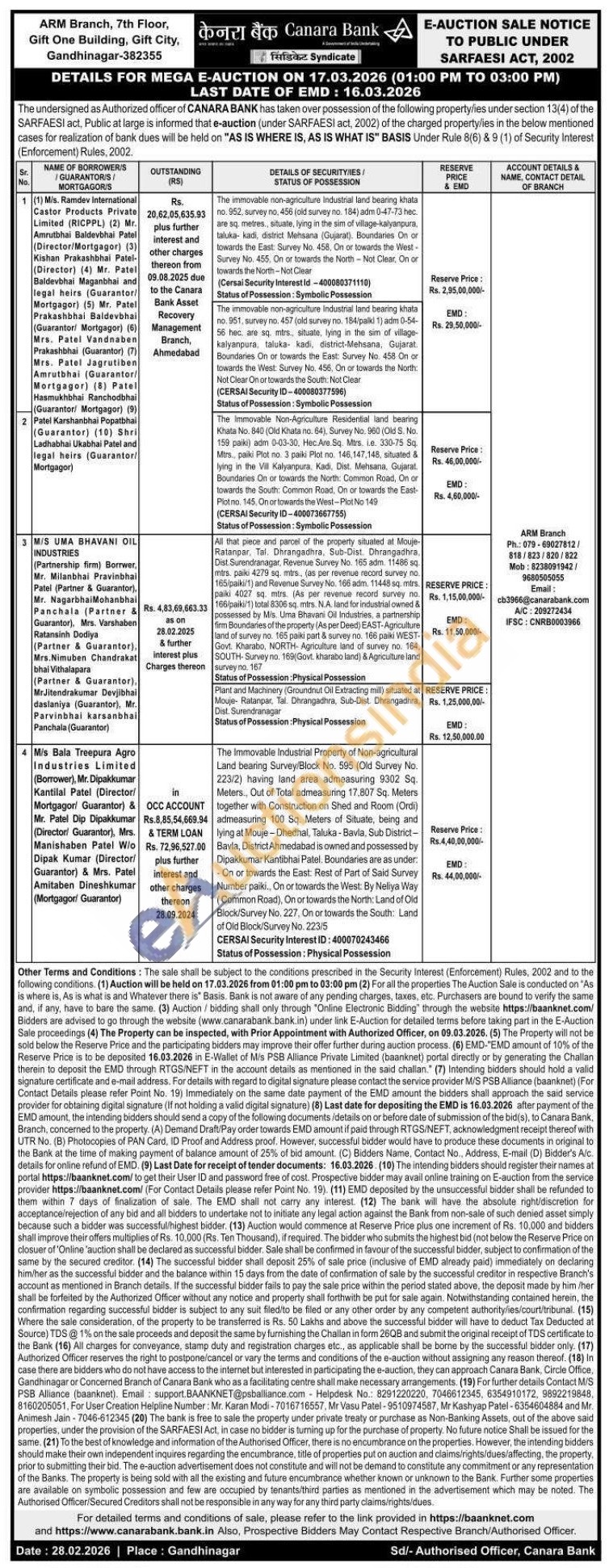 The immovable non-agriculture Industrial land bearing khata no. 952, survey no, 456 (old survey no. 184) adm 0-47-73 hec are sq. metres., situate, lying in the sim of village-kalyanpura, taluka- kadi, district Mehsana (Gujarat). Boundaries On or towards the East: Survey No. 458. On or towards the West-Survey No. 455. On or towards the North - Not Clear, On or towards the North-Not Clear (Cersai Security Interest Id-400080371110) Status of Possession: Symbolic Possession