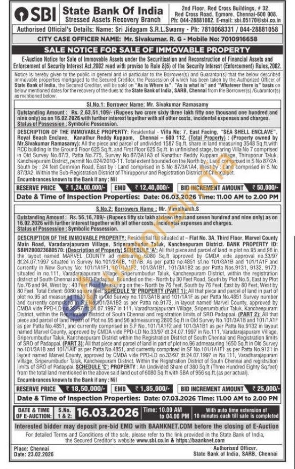 2) All that piece and parcel of land in plot no.95 and 96 in the layout named MARVEL COUNTY ad measuring 6080 Sq.ft approved by CMDA vide approval no.33/97 dt. 24.07.1997 situated in Survey No. 101/3448, 101/IB. As per patta no 4851 st.no 101/3A1B and 101/1A1F and Currently in New Survey No: 101/1A1F1, 101/1A1F2, 101/34181, 101/34182 as per Patta Nos.9131, 9132, 9173, situated in no.111, Varadarajapuram Village. Sriperumbudur Taluk, Kancheepuram District, within the registration district of South Chennai and SRO Padappal, Bounded on the:-North by 30 Feet Road, South by Plot No.5, East by Plot No. 76 and 94, West by 40 Feet Road Measuring on the:-North by 76 Feet, South by 76 Feet, East by 80 Feet, West by 80 Feet. Total Extent: 6080 square feet. SCHEDULE 'B' PROPERTY (PART 1): All that piece and parcel of land in part of plot no.95 ad measuring 1630 Sq.ft in Old Survey no. 101/3A18 and 101/1A1F as per Patta No.4851 Survey number and currently comprised in S.F.No.101/3A182 as per Patta no.9173, in layout named Marvel County, approved by CMDA vide PPD-LD no.33/97 dt.24.07.1997 in 111, Varadharajapuram Village, Sriperumbudur Taluk, Kancheepuram District, within the Registration District of South Chennal and registration limits of SRO Padappai. (PART 2): All that piece and parcel of land in part of Plot no.95 and 96 admeasuring 2800 Sq. ft in Old Survey No. 101/3418 and 101/1A1F as per Patta No.4851, and currently comprised in S.F No. 101/1A1F2 and 101/3A181 as per Patta No.9132 in layout named Marvel County, approved by CMDA vide PPD-LD No.33/97 1.24.07.1997 in No.111, Varadarajapuram Village, Sriperumbudur Taluk, Kancheepuran District within the Registration District of South Chennai and Registration limits of SRO of Padappai. (PART 3): All that piece and parcel of land in part of plot no.96 admeasuring 1650 Sq.ft in Old Survey no. 101/3418 and 101/1AIF as per Patta No.4851, and currently comprised in SF No. 101/1A1F1 as per Patta No.9131 in layout named Marvel County, approved by CMDA vide PPD-LD no.33/97 dt.24.07.1997 in No.111, Varadharajapuram Village, Sriperumbudur Taluk, Kancheepuram District. Within the Registration District of South Chennai and registration limits of SRO of Padappai. SCHEDULE "C": PROPERTY: An Undivided Share of 380 Sq.ft (Three Hundred Eighty Sq.feet) from the total land mentioned in the above said land out of 6080 Sq.ft with SBA of 956 sq ft. (as per actual). Encumbrances known to the Bank if any: Nil