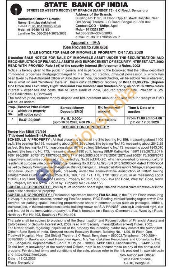 SCHEDULE 'A' PROPERTY: All that piece and parcel of the Site bearing No. 156, measuring about 1400 sq.ft. Site bearing No. 169, measuring about 2091.25 sq.feet, Site bearing No.170, measuring about 2042.25 sq.feet. Site bearing No. 171, measuring about 1977.5 sq.feet. Site bearing No. 172, measuring about 1943.010 sq.feet, Site bearing No. 173, measuring about 1890 sq.ft, having BBMP Katha Nos. 156/1993/2672,2071/169/1996/2061,2072/170/1997/2062,2073/171/1998/2063,2081/172/2007/2072 and 2082/173/2008/2073 respectively, said sites comprised in converted Sy. No.68 (old No.26), which is converted for non-agricultural residential purpose vide conversion order bearing No.B.DIS.ALN(S) SR (KT) 9/2003-04 dated 11/05/2004 issued by Deputy Commissioner, Bengaluru District, Bengaluru, situated at Mylasandra Village, KengeriHobli, Bengaluru South Taluk, Bengaluru, presently under the administrative Jurisdiction of BBMP, having amalgamated BBMP Katha No.2507/156, 169, 170, 171, 172, 173/1993/2672, in all measuring about 11344.01 sq.ft and bounded on East by: Property No. 157, 158, 155, 154 and Road, West by: Road, North by: Property No. 168 & 157, South by: Property No. 174 and 155. SCHEDULE 'B' PROPERTY: 268 sq.ft., of undivided share right, title and interest claim whatsoever in the land of the schedule 'A' property. SCHEDULE 'C' PROPERTY: Residential Apartment bearing Flat No.403, in the Fourth Floor, measuring 1125 sq. ft, super built up area, containing Two Bed rooms, RCC Roofing, vitrified flooring together with One covered car parking space, including proportionate share in common areas such as passages, lobbies, staircase, etc, in the multistoried residential building known as "SLV PRINSS", 268 sq.ft undivided right, title and interest in the immovable property, the Fiat is bounded on: East by: Common area, West by: Road, North by: Flat No.402, South by: Flat No.404
