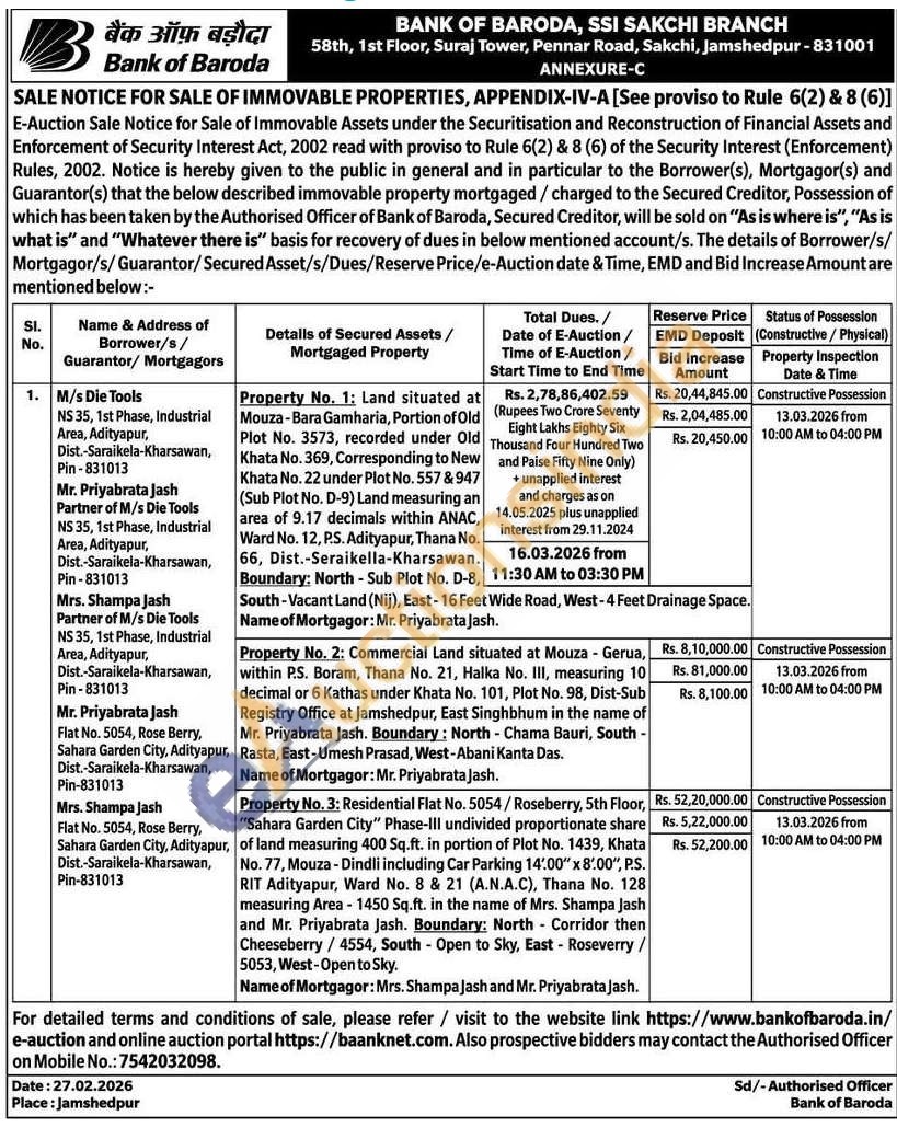 Property No. 2: Commercial Land situated at Mouza - Gerua, within P.S. Boram, Thana No. 21, Halka No. III, measuring 10 decimal or 6 Kathas under Khata No. 101, Plot No. 98, Dist-Sub Registry Office at Jamshedpur, East Singhbhum in the name of Mr. Priyabrata Jash. Boundary: North - Chama Bauri, South Rasta, East-Umesh Prasad, West-Abani Kanta Das. Name of Mortgagor: Mr. Priyabrata Jash.