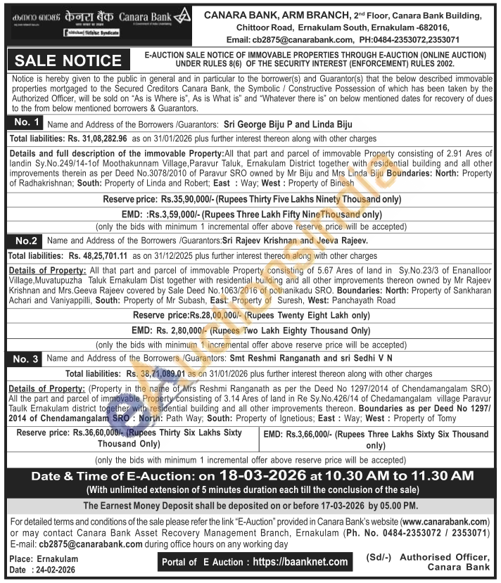 Details and full description of the immovable Property: All that part and parcel of immovable Property consisting of 2.91 Ares of landin Sy.No.249/14-1of Moothakunnam Village, Paravur Taluk, Ernakulam District together with residential building and all other improvements therein as per Deed No.3078/2010 of Paravur SRO owned by Mr Biju and Mrs Linda Biju Boundaries: North: Property of Radhakrishnan; South: Property of Linda and Robert, East: Way; West: Property of Binesh