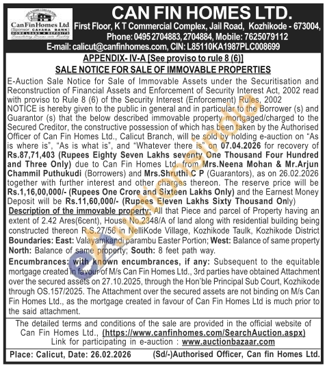 Description of the immovable property: All that Piece and parcel of Property having an extent of 2.42 Ares (6cent), House No.2348/A of land along with residential building being constructed thereon R.S.27/56 in NelliKode Village, Kozhikode Taulk, Kozhikode District Boundaries: East: Valayamkandi parambu Easter Portion; West: Balance of same property North: Balance of same property; South: 8 feet path way