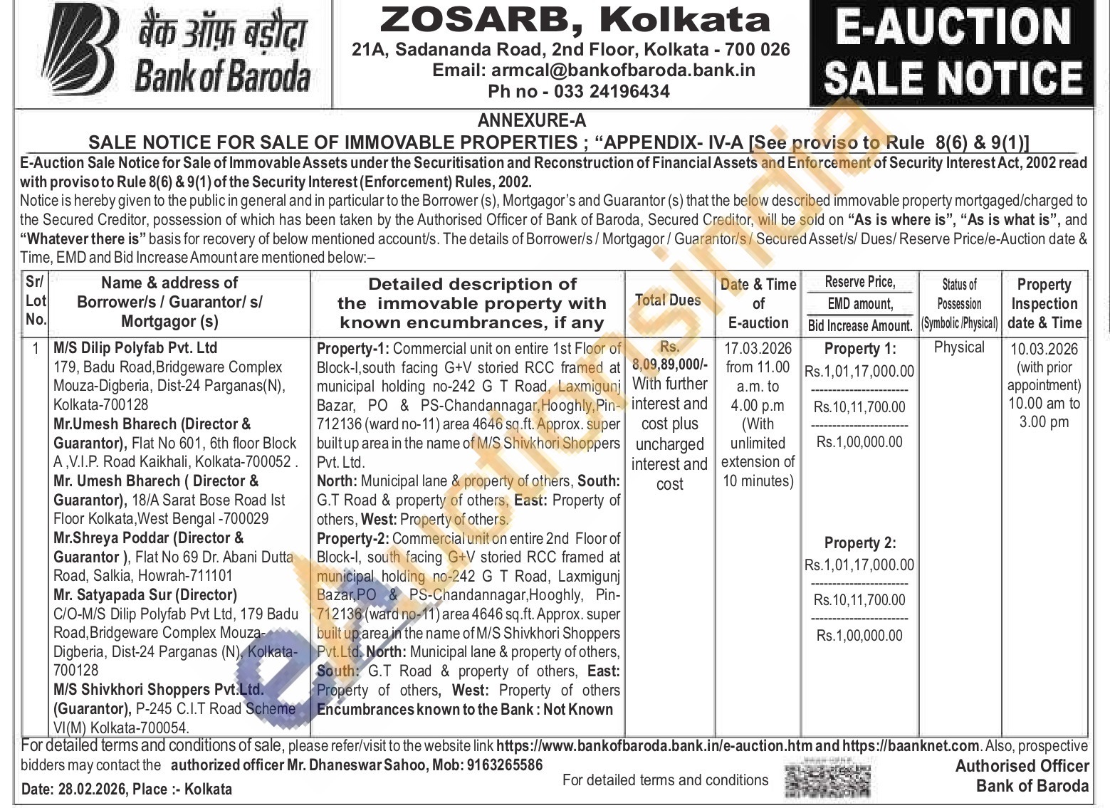 Property-2: Commercial unit on entire 2nd Floor of Block-l, south facing G+V storied RCC framed at municipal holding no-242 GT Road, Laxmigunj Bazar, PO & PS-Chandannagar, Hooghly, Pin-712136 (ward no-11) area 4646 sq.ft. Approx. super built up area in the name of M/S Shivkhori Shoppers Pvt.Ltd. North: Municipal lane & property of others, South: G.T Road & property of others, East: Property of others, West: Property of others Encumbrances known to the Bank: Not