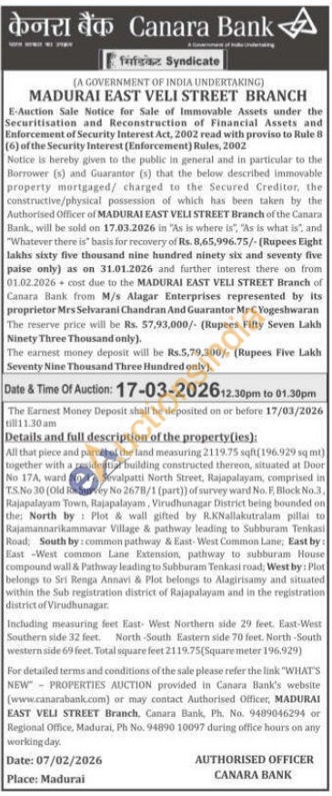Details and full description of the property (les): All that piece and parcel of the land measuring 2119.75 sqft(196.929 sq mi) together with a residential building constructed thereon, situated at Door No 17A, ward No 17. Sevalpatti North Street, Rajapalayam, comprised in T.S.No 30 (Old Re Survey No 2678/1 (part)) of survey ward No. F, Block No.3. Rajapalayam Town, Rajapalayam, Virudhunagar District heing bounded on the North by Plot & wall gifted by R.KNallakutralam pillai to Rajamannarikammavar Village & pathway leading to Subburam Tenkasi Road, South by: common pathway & East-West Common Lane, East by: East-West common Lane Extension, pathway to subburam House compound wall & Pathway leading to Subburam Tenkasi road; West by: Plot belongs to Sri Renga Annavi & Plot belongs to Alagirisamy and situated within the Sub registration district of Rajapalayam and in the registration district of Virudhunagar