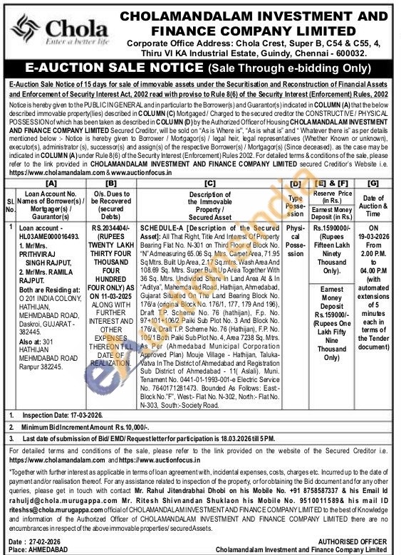SCHEDULE-A [Description of the Secured Asset]: All That Right, Title And Interest Of Property Bearing Flat No. N-301 on Third Flaar of Black No. "N'Admeasuring 65.06 Sq. Mtrs. Carpet Area, 71.95 Sq Mtrs. Built Up Area, 2.17 Sq.mtrs. Wash Area And 108.69 Sq. Mirs. Super Built Up Area Together With 36 Sq. Mtrs. Undivided Share In Land Area At & In "Aditya", Mahemdavad Road, Hathijan, Ahmedabad, Gujarat Situated On The Land Bearing Block No. 176/a (original Block No. 176/1, 177, 179 And 196), Draft T.P. Scheme No. 76 (hathijan), F.p. No. 97+101+106/2 Paiki Sub Plot No. 3 And Block No. 176/a, Draft T.P. Scheme No. 76 (Hathijan), F.P. No. 105/1 Both Paiki Sub Plot No. 4, Arma 7238 Sq. Mtrs. As Per (Ahmedabad Municipal Corporation Approved Plan) Mouje Village Hathijan, Taluka-Valva In The District of Ahmedabad and Registration Sub District of Ahmedabad 11 Aslali). Muni. Tenament No. 0441-01-1993-001-e Electric Service No. 7640171281473. Bounded As Follows: East:-Block No. F, West-Flat No. N-302, North:- Flat No. N-303, South-Society Road