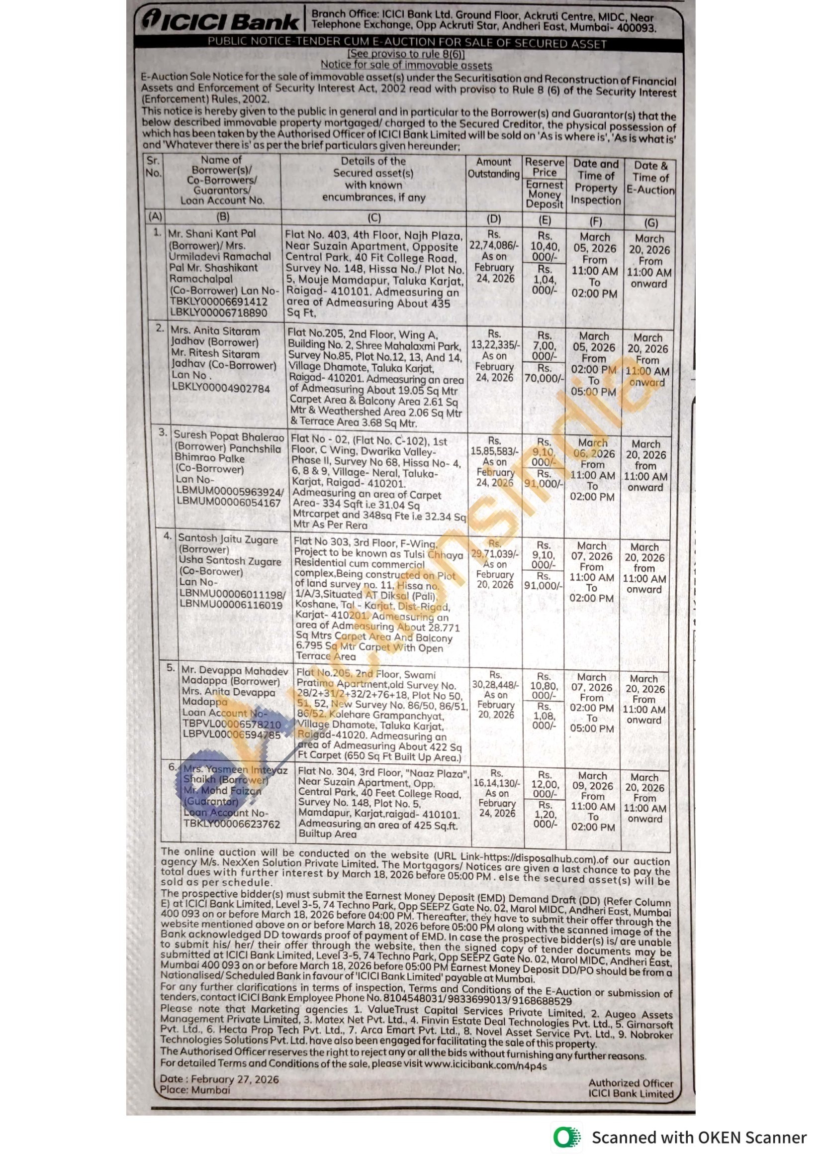 Flat No 303, 3rd Floor, F-Wing. Project to be known as Tulsi Chhaya Residential cum commercial complex, Being constructed on Plot of land survey no. 11, Hissa no. 1/A/3.Situated AT Diksal (Pali), Koshane, Tol-Korjat, Dist-Rigad, Karjat-410201. Admeasuring an area of Admeasuring About 28.771 Sq Mtrs Carpet Area And Balcony 6.795 Sq Mtr Corpet With Open Terrace Area