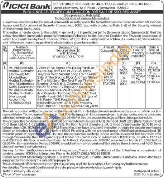 A Site of An Extent of 54 1/4 Sq. Yards or 45.360 Sq. Mtrs Out of 217 Sq. Yards Together With Second Shop From South Side of The Ground Floor And Two Shops In The Middle of The First Floor Therein Bearing D.no.3-6-1. Covered By Ward No.22 of Kovvur Village And Panchayat. Kovvuru Mandal, West Godavari District And Bounded By: East: Rood-74-5 Feet South: Road-26-0 Feet West: 1st Item of 4th Party-73-0 Feet North: Shop of Kallepali Gandhi- 27-0 Feet, Property Size-180 Sft 3 shops, UDS 54.5 Sq yards