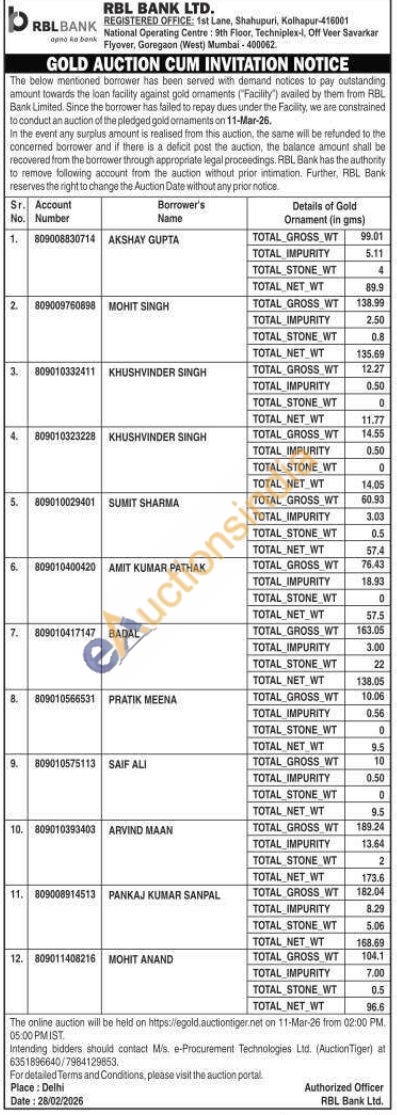 RBL Bank Gold Auctions Auction in Kolhapur