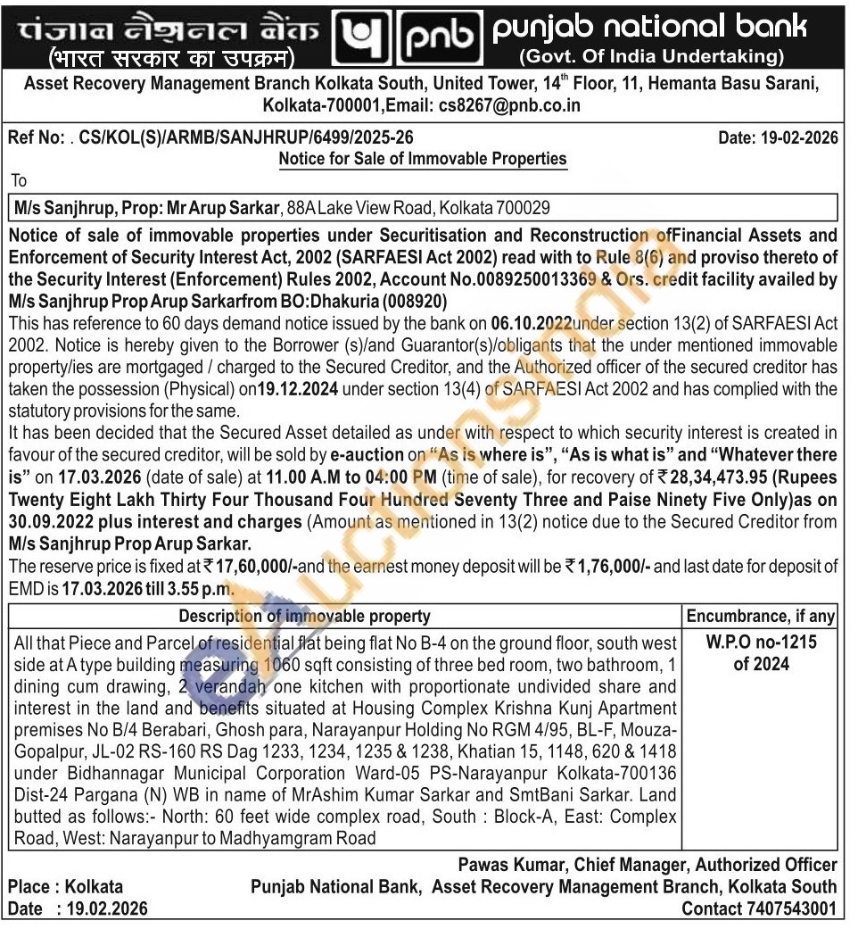 All that Piece and Parcel of residential flat being flat No B-4 on the ground floor, south west side at A type building measuring 1060 sqft consisting of three bed room, two bathroom, 1 dining cum drawing, 2 verandah one kitchen with proportionate undivided share and interest in the land and benefits situated at Housing Complex Krishna Kunj Apartment premises No B/4 Berabari, Ghosh para, Narayanpur Holding No RGM 4/95, BL-F, Mouza-Gopalpur, JL-02 RS-160 RS Dag 1233, 1234, 1235 & 1238, Khatian 15, 1148, 620 & 1418 under Bidhannagar Municipal Corporation Ward-05 PS-Narayanpur Kolkata-700136 Dist-24 Pargana (N) WB in name of MrAshim Kumar Sarkar and SmtBani Sarkar. Land butted as follows:- North: 60 feet wide complex road, South: Block-A, East: Complex Road, West: Narayanpur to Madhyamgram Road