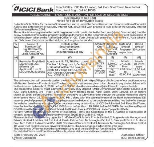 Apartment No 78, 7th Floor tower 11, Plot No. 11. Belgravia II, Central Park II, Situated Within The Revenue Estate Of Village Tikri, Sector 48, Dist- Gurgaon, Gurgaon Haryana Area-2350 Sq Ft