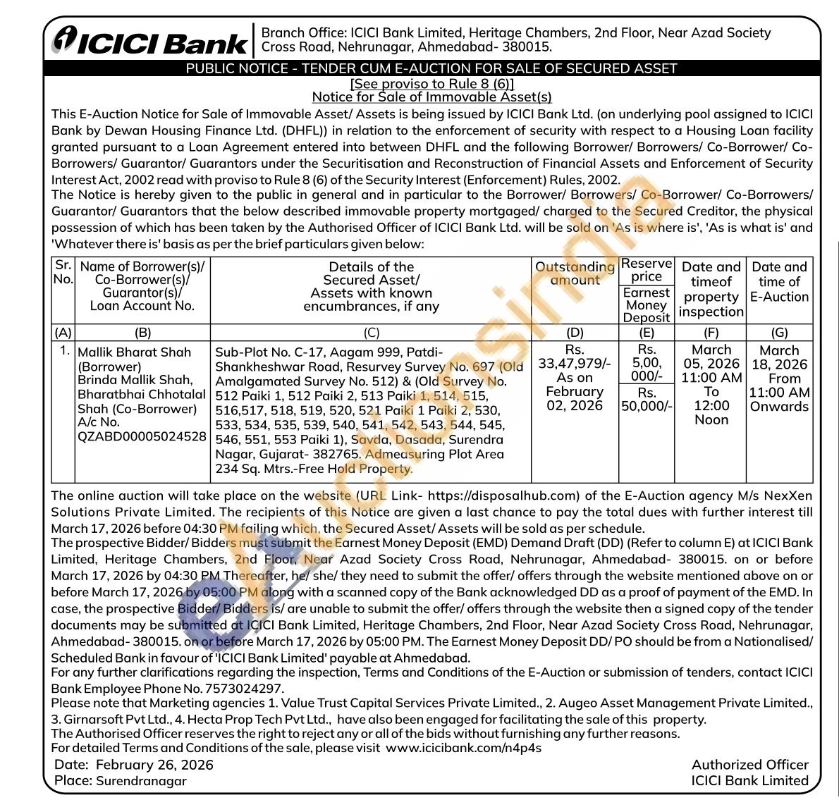 Sub-Plot No. C-17, Aagam 999, Patdi-Shankheshwar Road, Resurvey Survey No. 697 (Old Amalgamated Survey No. 512) & (Old Survey No. 512 Paiki 1, 512 Paiki 2, 513 Paiki 1, 514, 515, 516,517, 518, 519, 520, 521 Paiki 1 Paiki 2, 530, 533, 534, 535, 539, 540, 541, 542, 543, 544, 545, 546, 551, 553 Paiki 1), Savda, Dasada, Surendra Nagar, Gujarat- 382765. Admeasuring Plot Area 234 Sq. Mtrs.-Free Hold Property