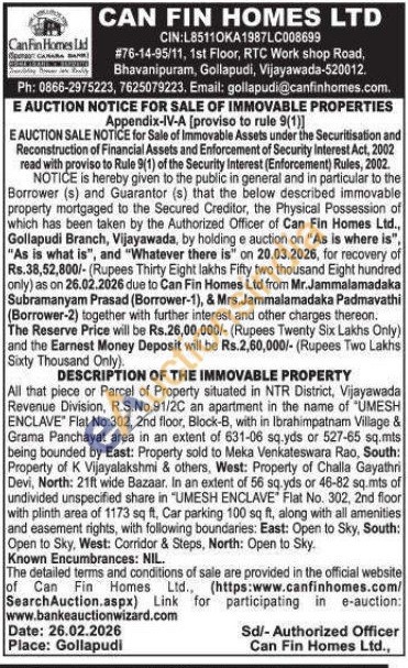 DESCRIPTION OF THE IMMOVABLE PROPERTY : All that piece or Parcel of Property situated in NTR District, Vijayawada Revenue Division, R.S.No.91/2C an apartment in the name of "UMESH ENCLAVE" Flat No:302, 2nd floor, Block-B, with in Ibrahimpatnam Village & Grama Panchayat area in an extent of 631-06 sq.yds or 527-65 sq.mts being bounded by East: Property sold to Meka Venkateswara Rao, South: Property of K Vijayalakshmi & others, West: Property of Challa Gayathri Devi, North: 21ft wide Bazaar. In an extent of 56 sq.yds or 46-82 sq.mts of undivided unspecified share in "UMESH ENCLAVE Flat No. 302, 2nd floor with plinth area of 1173 sq ft, Car parking 100 sq ft, along with all amenities and easement rights, with following boundaries: East: Open to Sky, South: Open to Sky, West: Corridor & Steps, North: Open to Sky