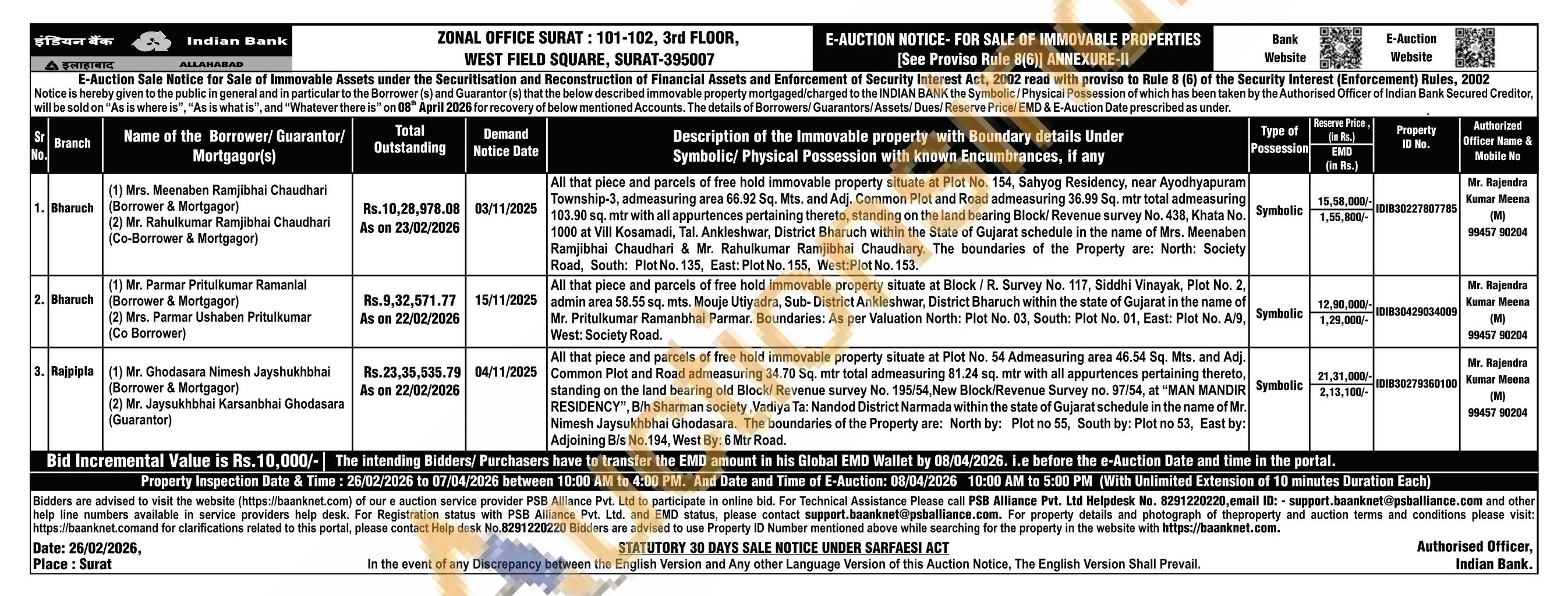 All that piece and parcels of free hold immovable property situate at Plot No. 154, Sahyog Residency, near Ayodhyapuram Township-3, admeasuring area 66.92 Sq. Mits, a Mts. and Adj. Common Plot and Road admeasuring 36.99 Sq. mtr total admeasuring 103.90 sq. mtr with all appurtences pertaining thereto, standing on the land bearing Block/Revenue survey No. 438, Khata No. 1000 at Vill Kosamadi, Tal. Ankleshwar, District Bharuch within the State of Gujarat schedule in the name of Mrs. Meenaben. Ramjibhai Chaudhari & Mr. Rahulkumar Ramjibhai Chaudhary. The boundaries of the Property are: North: Society Road, South: Plot No. 135, East: Plot No. 155, West: Plot No. 153.