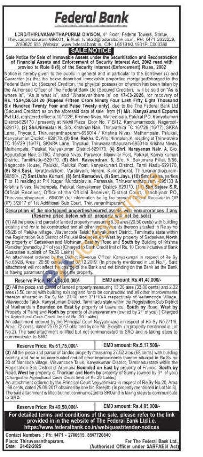 ) All the piece and parcel of landed property measuring 13.36 ares (33.00 cents) and 2.22 ares (5.50 cents) with building existing and for to be constructed and all other improvements thereon situated in Re. Sy No. 271/8 and 271/10-A respectively of Vellamcode Vilage Vilavancode Taluk, Kanyakumar District, Tamilnadu state within the Registration Sub District of Marthandam Bounded on East by property of Lawrence South by Road. West by Property of Palraj and North by property of Jnanavaranam (owned by 2 of you) Charged to Agricultural Cash Credit limit of Rs. 20 Lakhs) An attachment ordered by the Principal Court Neyyatinkara in respect of Re Sy No 27118 Area: 72 cents, dated 25.09.2017 obtained by one Mr. Sreejith. (in property mentioned in Lot No.2). The said attachment is filed but not communicated to SRO and is taking steps to communicate to SRO