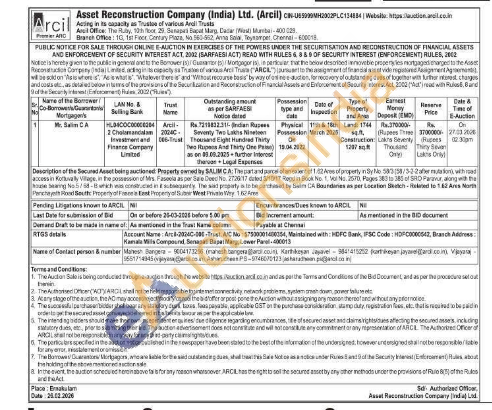 Description of the Secured Asset being auctioned: Property owned by SALIM CA; The part and parcel of an extent of 1.62 Ares of property in Sy No: 58/3(58/3-2-2 after mutation), with road access in Kottuvally Village, in the possession of Mrs. Faseela as per Sale Deed No. 2726/17 dated 5/10/17 Regd in Book No. 1, Vol No. 2570, Pages 383 to 385 of SRO Paravur, along with the house bearing No 5/68-B which was constructed in it subsequently. The said property is to be purchased by Saim CA Boundaries as per Location Sketch-Related to 1.62 Ares North Panchayath Road South: Property of Faseola East Property of Subair West Privato Way: 1.62 Ares
