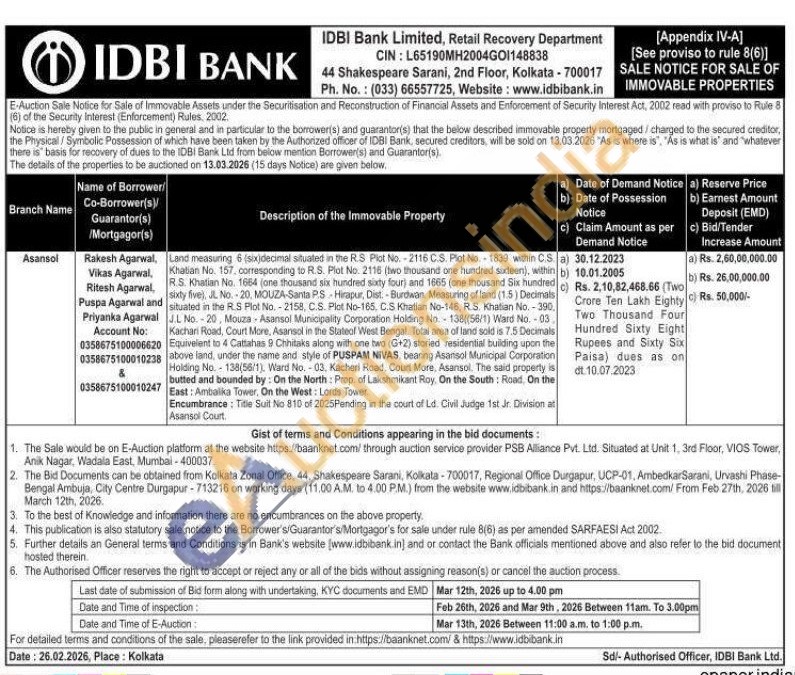 Land measuring 6 (six)decimal situated in the R.S Plot No.-2116 C.S. Plot No. 1839 within CS aj Khatian No. 157, corresponding to R.S. Plot No. 2116 (two thousand one hundred sixteen), within R.S. Khatian No. 1664 jone thousand six hundred sixty four) and 1665 (one thousand Six hundred sixty five), JL. No.-20, MOUZA-Santa PS-Hirapur, Dist-Burdwan. Measuring of land (1.5) Decimals situated in the R.S Plot No.-2158, C.S. Plot No-165. C.S Khatian No-146, R.S. Khatian No.-390, J.L No.-20, Mouza Asansol Municipality Corporation Holding No.-138((56/1) Ward No.-03 Kachari Road, Court More, Asansol in the Stateof West Bengal. Total area of land sold is 7.5 Decimals Equivelent to 4 Cattahas 9 Chhitaks along with one two (G+2) storied residential buliding upon the above land, under the name and style of PUSPAM NIVAS, bearing Asansol Municipal Corporation Holding No.-138(56/1), Ward No.-03. Kacheri Road, Court More. Asansol, The said property is butted and bounded by: On the North: Prop of Lakshmikant Roy. On the South: Road. On the East: Ambalika Tower, On the West: Lords Tower Encumbrance: Title Sull No 810 of 2025Pending in the court of Ld. Civil Judge 1st Jr. Division at Asansol Court