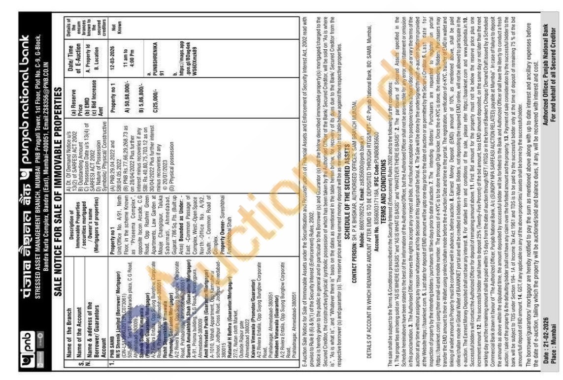 Unit Office No. A/91, Ninth Floor, in the scheme Known as "Priseema Complex" opposite Iscon Arcade, C.G Road, Opp Rashmi Green Apartments, Law Garden at Mouje Changispur, Taluka Sabarmati, Ahmedabad, Gujarat 786 Sq. Rs. (Built up Arma) Bounded as Under: East -Common Passage of Complex, West-Open Space North:-Office No. A/92. South Common Road of Complex Property Owner-Sureshbhai Amulakhbhai Shah