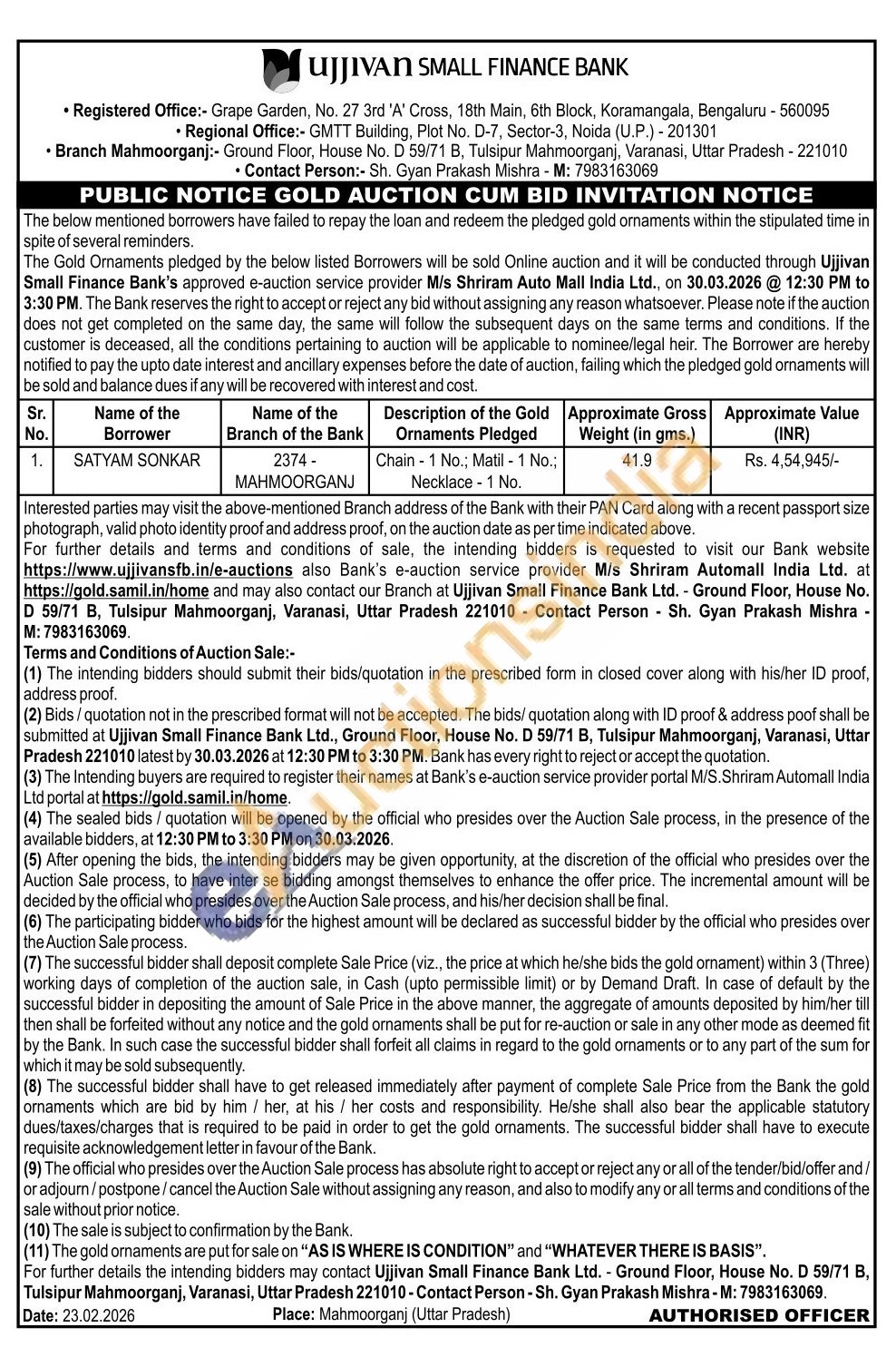 Ujjivan Small Finance Bank Gold Auctions Auction in Bengaluru