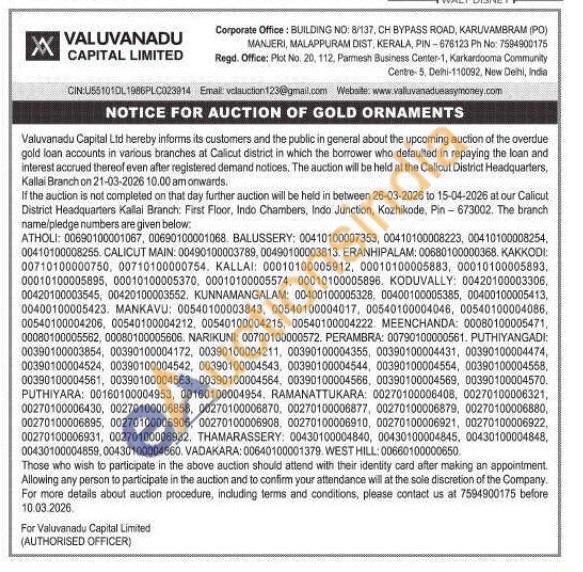 Valuvanadu Capital Limited Gold Auctions Auction in Malappuram