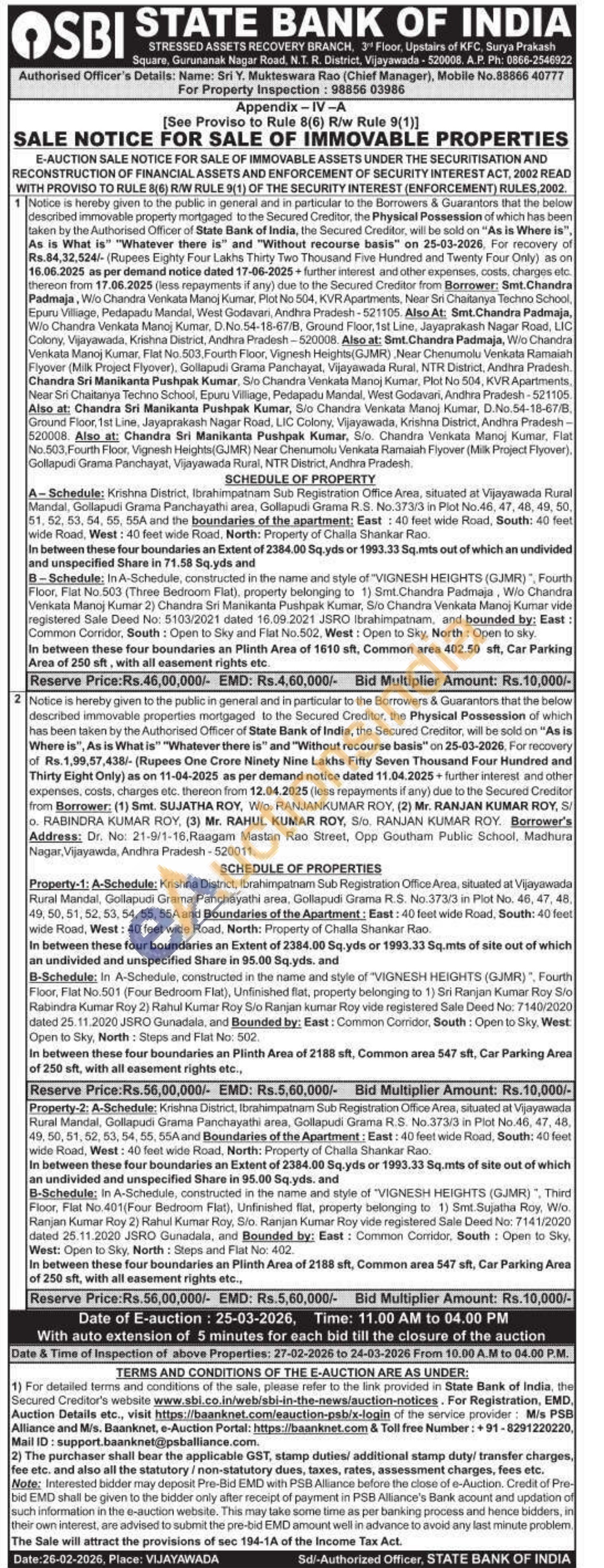 Property-2: A-Schedule: Krishna District, Ibrahimpatnam Sub Registration Office Area, situated at Vijayawada Rural Mandal, Gollapudi Grama Panchayathi area, Gollapudi Grama R.S. No.373/3 in Plot No.46, 47, 48, 49, 50, 51, 52, 53, 54, 55, 55A and Boundaries of the Apartment: East: 40 feet wide Road, South: 40 feut wide Road, West: 40 feet wide Road, North: Property of Challa Shankar Rao. In between these four boundaries an Extent of 2384.00 Sq.yds or 1993.33 Sq.mts of site out of which an undivided and unspecified Share in 95.00 Sq.yds. and B-Schedule: In A-Schedule, constructed in the name and style of 'VIGNESH HEIGHTS (GJMR), Third Floor, Flat No.401(Four Bedroom Flat), Unfinished flat, property belonging to 1) Smt Sujatha Roy, Wio. Ranjan Kumar Roy 2) Rahul Kumar Roy, Sto. Ranjan Kumar Roy vide registered Sale Deed No: 7141/2020 dated 25.11.2020 JSRO Gunadala, and Bounded by: East: Common Comidor, South: Open to Sky, West: Open to Sky, North: Steps and Flat No: 402. In between these four boundaries an Plinth Area of 2188 sft, Common area 547 sft. Car Parking Area of 250 sft, with all easement rights etc..