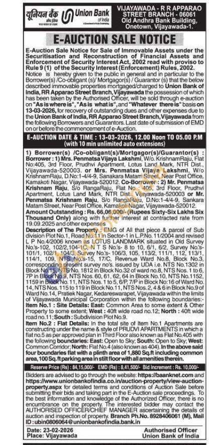 Description of The Property: EMG of All that piece & parcel of Sub division Plot No.1, Road No. 11 in Sector-1 in LP.No. 11/2004 and revised LP No.4/2006 known as LOTUS LANDMARK situated in Old Survey No.'s-102, 102/2,104-1C, NTS No's- 8 to 10, 6/1, 6/2, Survey No's-101/1, 102/1, 104/3, Survey No.'s-106/3, 105, 113/2, 111/1, 112, 113/1, 114/1, 109, NTS No.s-15, 17/C, Revenue Ward No.8, Block No.3, corresponding present survey no's, issued by UDA i.e. NTS No. 1302 in Block No.15, NTS No. 1812 in Block No.32 of ward no.8, NTS Nos. 1 to 6, 7P in Block No.9, NTS Nos. 60, 61, 62, 64 in Block No. 10, NTS No.1152, 1159 in Block No. 11, NTS Nos. 1 to 5, 6/P, 7/P in Block No:16 of Ward No. 14, NTS Nos. 115 to 119 in Block No. 11, NTS Nos. 2, 4 & 6 in Block No.9 of Ward No.14, Pratiek Nagar, Kedareswarapet, Vijayawada within the limits of Vijayawada Municipal Corporation within the following boundaries:-Item No.1: Site Details: East: Common Area to some extent & Other Property to some extent; West: 40ft wide road no.12; North: 40ft wide road no.11: South: Subdivision Plot No.9. Item No.2: Flat Details: In the total site of Item No.1 Apartments are constructing under the name & style of PRUDVI APARTMENTS in which a flat no.5 as per approved plan in Third Floor also known as Flat No.405 with the following boundaries: East: Open to Sky, South: Open to Sky; West: Common Corridor, North: Flat No. 4 (also known as 404). In the above said four boundaries flat with a plinth area of 1,880 Sq.ft including common area, 100 Sq.ft parking area in stilt floor with all amenities therein