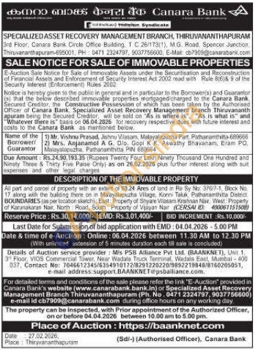 All part and parcel of property with an extent of 03.24 Ares of land in Ra Sy No: 376/7-1, Block No. 17 along with the building there on in Maayalapuzha Vilage, Konni Taluk Pathanamthita Distict BOUNDARIES (as per location skarichi: Eait: Property of Shyam Vilasam Kashnan Nar, West: Property of Karunakanan Nair, North Road, South Property of Vşayan Nair (CERSAL ID: 400067151508