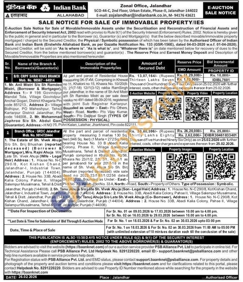 All part and parcel of Residential House measuring OK-54M, Comprising in Khewat no 11. Khatoni no 15, Khasra No. 10/20( 0), 21(7-18) 12/11(3-12) rakba RamSingh pur Jalandhar, in the name of Sh Anil Mist s/o Sh Ramdeo Mistri as per sale deed vasika no 491 dated 08-09-2016, registered with joint Sub Registrar Kartarpur. Bounded as under: East:- P/o Others, West: Road, North:- P/o Vijay Kumar, South: P/o Daljitpal Singh (TYPES OF POSSESSION: PHYSICAL)