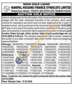 MANIPAL HOUSING FINANCE SYNDICATE LIMITED Gold Auctions Auction in Udupi
